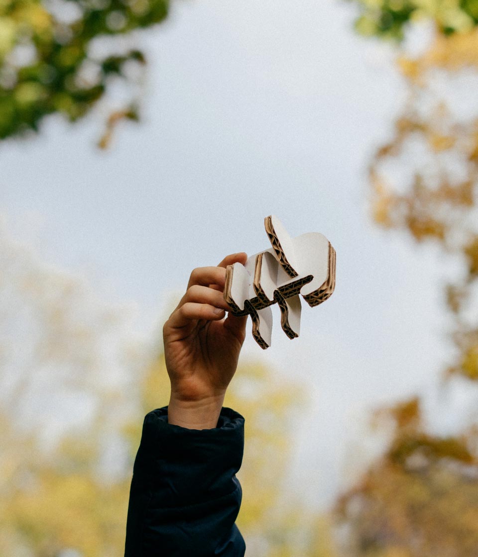 Unsere Spielwelten bestehen zu hundert Prozent aus heimischer Wellpappe. Wellpappe ist ein Vorzeige-Kreislaufprodukt. Es muss kein Baum dafür gefällt werden. Es kann bis zu 25 Mal recycelt werden, ist biologisch abbaubar und bindet mehr CO2 als es in seiner Produktion freisetzt. Dazu ist Wellpappe extrem stabil und robust. Der Aufbau unserer Produkte funktioniert durch ein innovatives Stecksystem, das den Produkten Stabilität gibt. Dafür werden keine Kleber, Kunststoffe oder Werkzeuge benötigt.